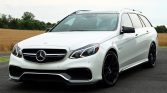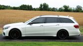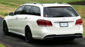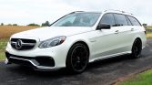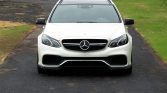 This 2015 Mercedes-AMG E63 S 4MATIC wagon is finished in Diamond White Metallic over black leather and powered by a twin-turbocharged 5.5-liter V8 paired with a seven-speed automatic transmission and 4MATIC all-wheel drive. Equipment includes an aftermarket carbon fiber front splitter, the AMG Exterior Carbon package, black-finished 19″ AMG wheels, dynamic LED headlights, a panoramic sunroof, heated and ventilated dynamic front seats, an aftermarket carbon fiber steering wheel, Keyless-GO, heated rear seats, the Driver Assistance and Parking…