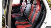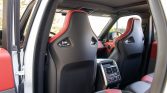 The seating surfaces are upholstered in Ebony and Pimento leather and are accompanied by a matching center console, dashboard, and door panels. Interior amenities include heated and ventilated power-adjustable front seats, heated rear seats, a Meridian sound system, adaptive cruise control, navigation, carbon fiber veneer trim, and a touchscreen infotainment system.
