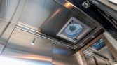 The rear cabin features a raised and coffered ceiling, engineered Dekton porcelain flooring, and fabricated storage cabinets. Appointments include a Dometic refrigerator, two-burner cooktop, and sink along with a swiveling video monitor, a Contoure microwave, a Dish Network receiver, a DVD player, a Marantz audio-visual receiver, an accessory cabin heater, automatic window blinds, and manually-sliding ceiling panels for the skylights. Control modules for the solar, air conditioning, generator, water tanks, and battery systems are housed in a cabinet, and cabin controls are adjusted via tablet or wall-mounted switch panels.
