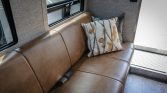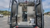 A magnetic pocket door separates the rear of the cabin from the lavatory, which can also be accessed through the rear barn doors. It is equipped with a stainless-steel shower pan with a rubberized mat along with a Dometic commode, a glass sink basin, a faucet, a handheld shower attachment, and a ceiling-mounted vent fan. A diesel-fired water heating system is outfitted.