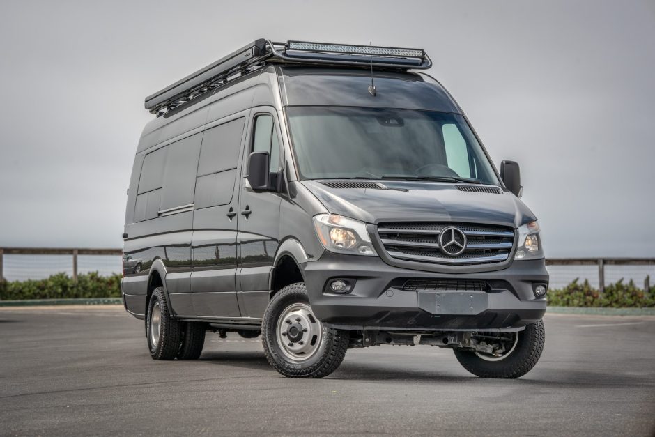 This 2017 Mercedes-Benz Sprinter 3500XD is a high-roof van that was designed as a recreational vehicle by Canepa of Scotts Valley, California, and constructed by its affiliate company Concept Transporters of Fresno, and was acquired new by the current owner. The cabin has been outfitted with a kitchenette, engineered porcelain flooring, a textured fabric headliner, automatic window shades, video monitors, multimedia receivers, recessed lighting, hideaway beds, and heated front seats trimmed in brown leather, while a lavatory with a handheld shower, a stainless-steel shower pan, a sink, and a commode resides at the partitioned rear section. The van wears a graphite finish and is powered by a 3.0-liter turbodiesel V6 linked that sends power to all four wheels through a five-speed automatic transmission. A roof rack with an awning, an air conditioner, solar panels, and an in-motion tracking satellite receiver was installed during the build, and additional equipment includes a dually rear axle, a rear ladder, a diesel-powered PowerTech 3000W generator, retractable side steps, utility hookups, and a sliding side door.