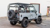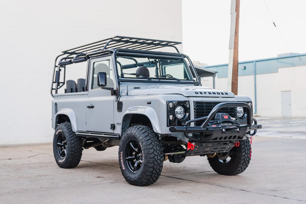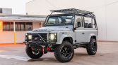 The Osprey OC90 is manufactured in the style of an NAS Defender 90 using a combination of factory and rebuilt Land Rover parts as well as varios aftermarket components. The aluminum body panels on this example are finished in Khaki Grey and are mounted to a galvanized chassis. The external roll cage, roof rack, front bull bar, NAS-style rear bumper, and rock sliders are powder-coated black, and the LED exterior lights wear tinted lenses. Additional equipment includes a Warn electric winch, body-color wheel arch extensions, aluminum door hardware, and an integrated receiver hitch.