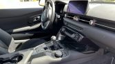 The heated power-adjustable sport seats are upholstered in black leather with white stitching that extends to the upper dashboard, center console, and door panel inserts. Carbon-fiber trim accents the cabin, and additional appointments include driver-seat position memory, dual-zone automatic climate control, a GR-logo shift knob, and a 12-speaker JBL sound system connected to an 8.8″ touchscreen infotainment system with navigation, Apple Carplay, and Bluetooth connectivity.