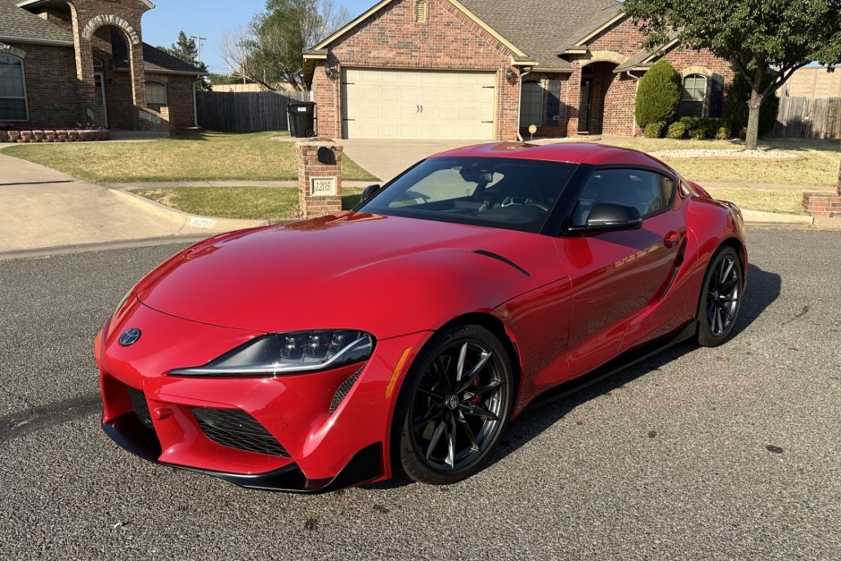 This 2023 Toyota GR Supra is a Premium example that is powered by a turbocharged 3.0-liter inline-six linked to a six-speed manual transmission and an active rear differential. Finished in Renaissance Red paint over black leather upholstery, it was ordered with the Driver Assist Package and is further equipped with adaptive sport suspension, Brembo front brake calipers, and 19″ forged aluminum wheels. Other features include a head-up display, heated sport seats, carbon-fiber interior trim, navigation, and a JBL sound system in addition to an 8.8″ touchscreen infotainment system with navigation, Apple CarPlay, and Bluetooth connectivity.